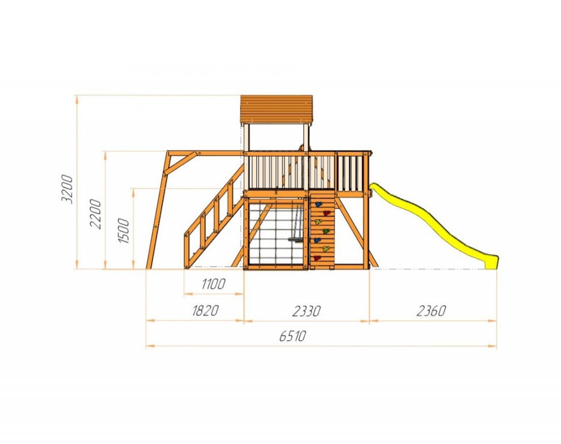 Детские площадки изготовлены в соответствии с ГОСТ Р 52168-2012. Опоры и несущие элементы изделия изготовлены из клееного бруса карельской сосны 90х90 мм, доска 45х90мм, 45х140мм, другие перекрытия 20х90мм доска, ограждение и иные элементы из массива сосны. Везде используется сухая доска. Высота платформы 1,5 метра.