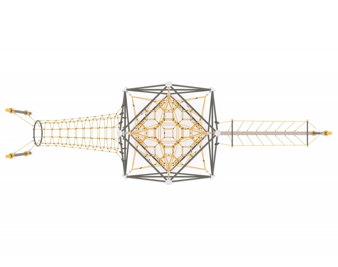 Представляет собой геометрическую фигуру, состоящую из канатной сетки, тоннеля из каната, подвесного моста и металлического каркаса.