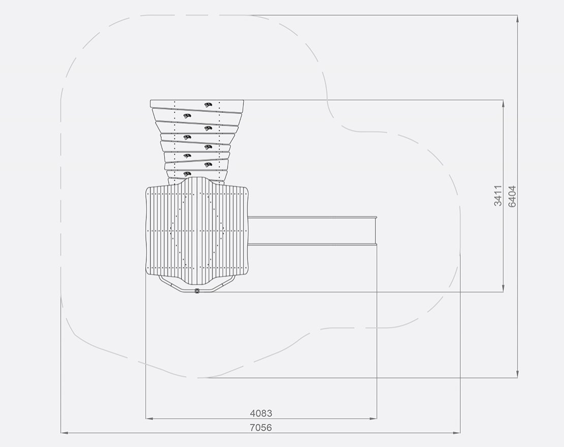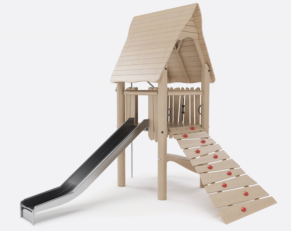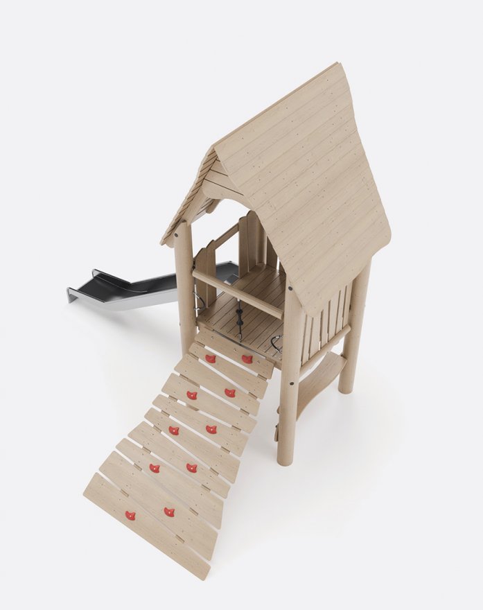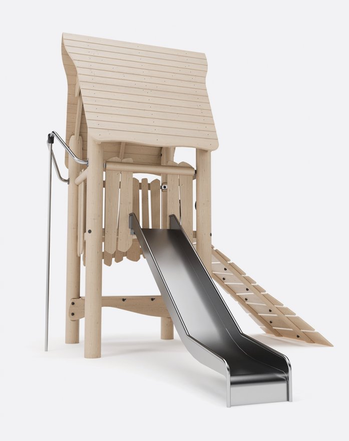 Состоит из опорных стоек, пандуса со скалодромными зацепами, металлической трубы-лазалки и открытой горки с защитными бортиками.