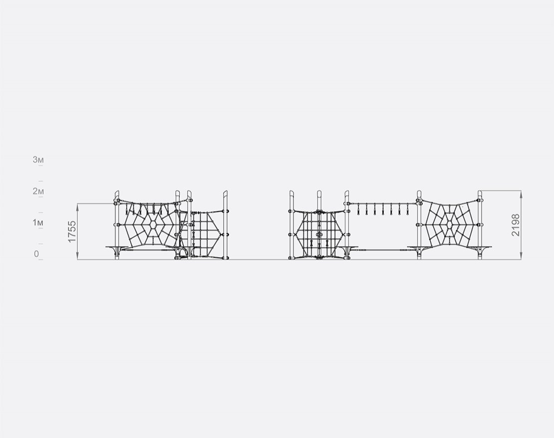 Состоит из каркаса, выполненного из опорных металлических стоек, канатных сеток и рукохода.