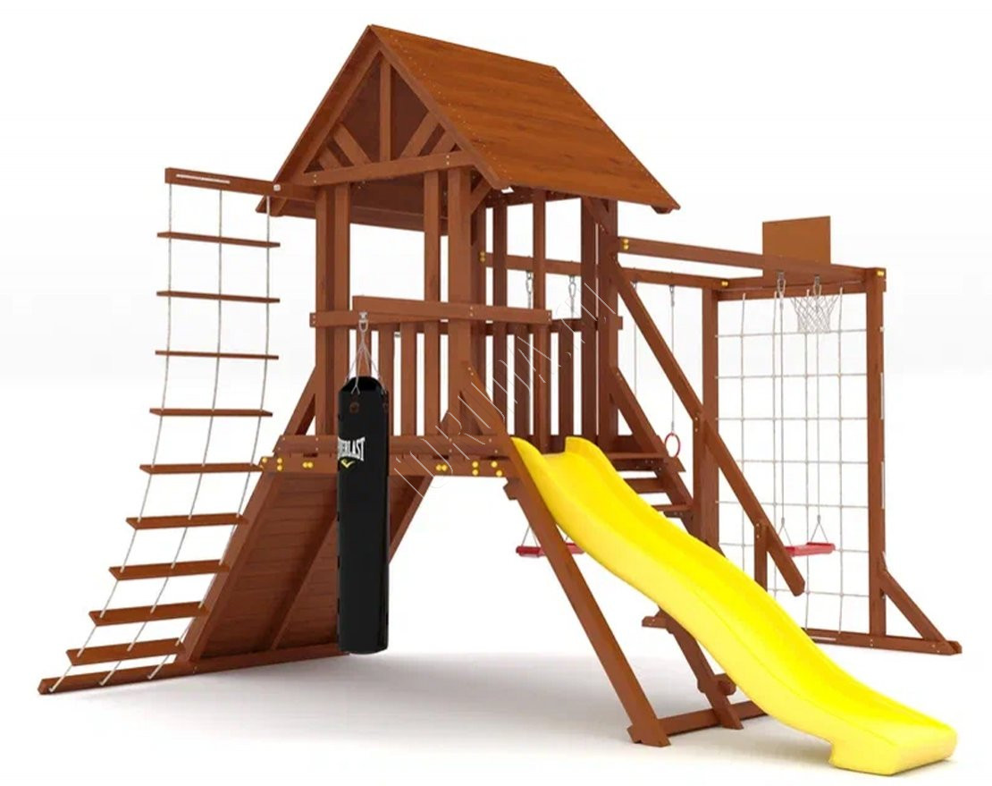Продуманное игровое пространство, которое сочетает активные развлечения и спортивные элементы. Подходит для детей разного возраста и станет отличным решением для дачного участка или загородного дома.