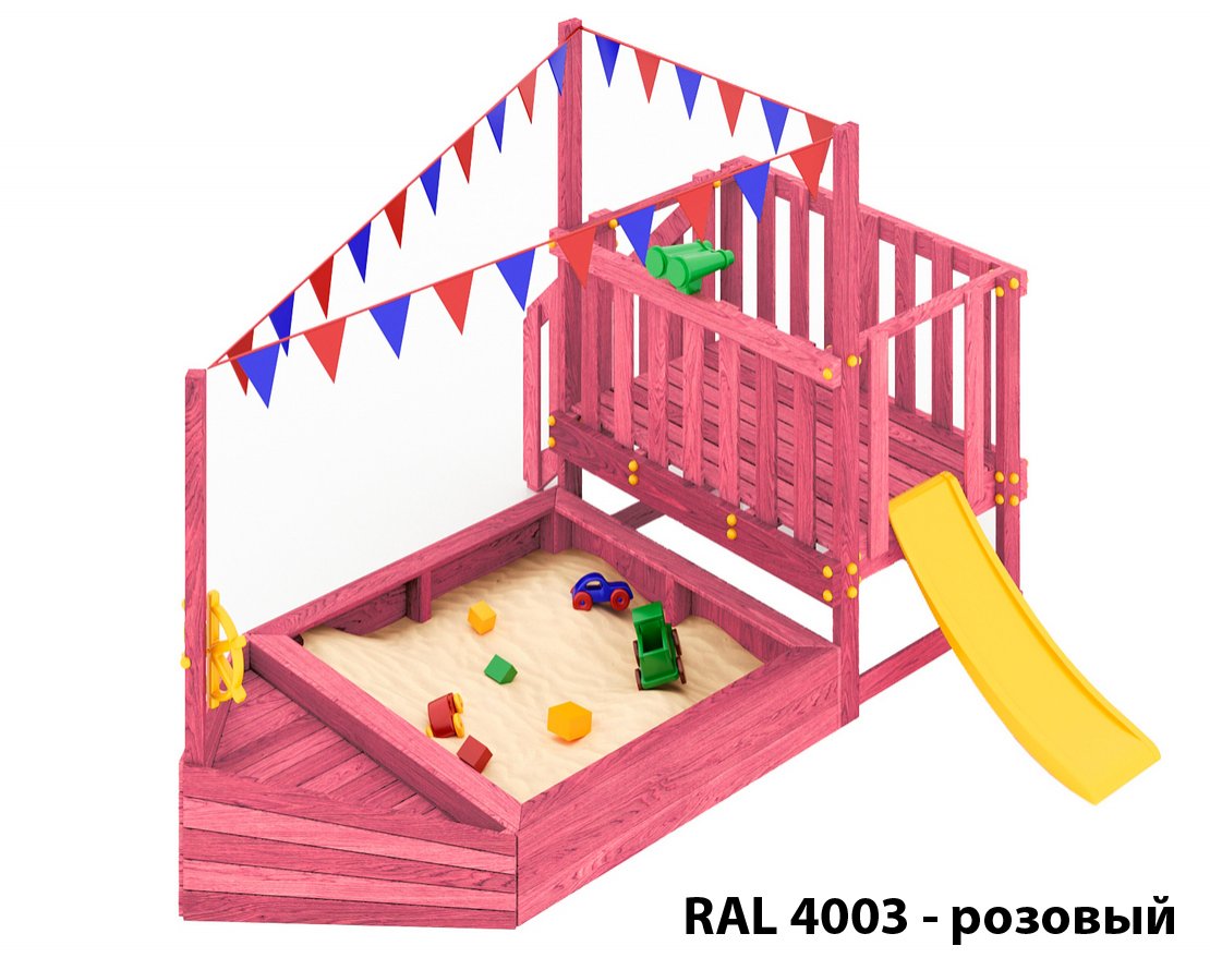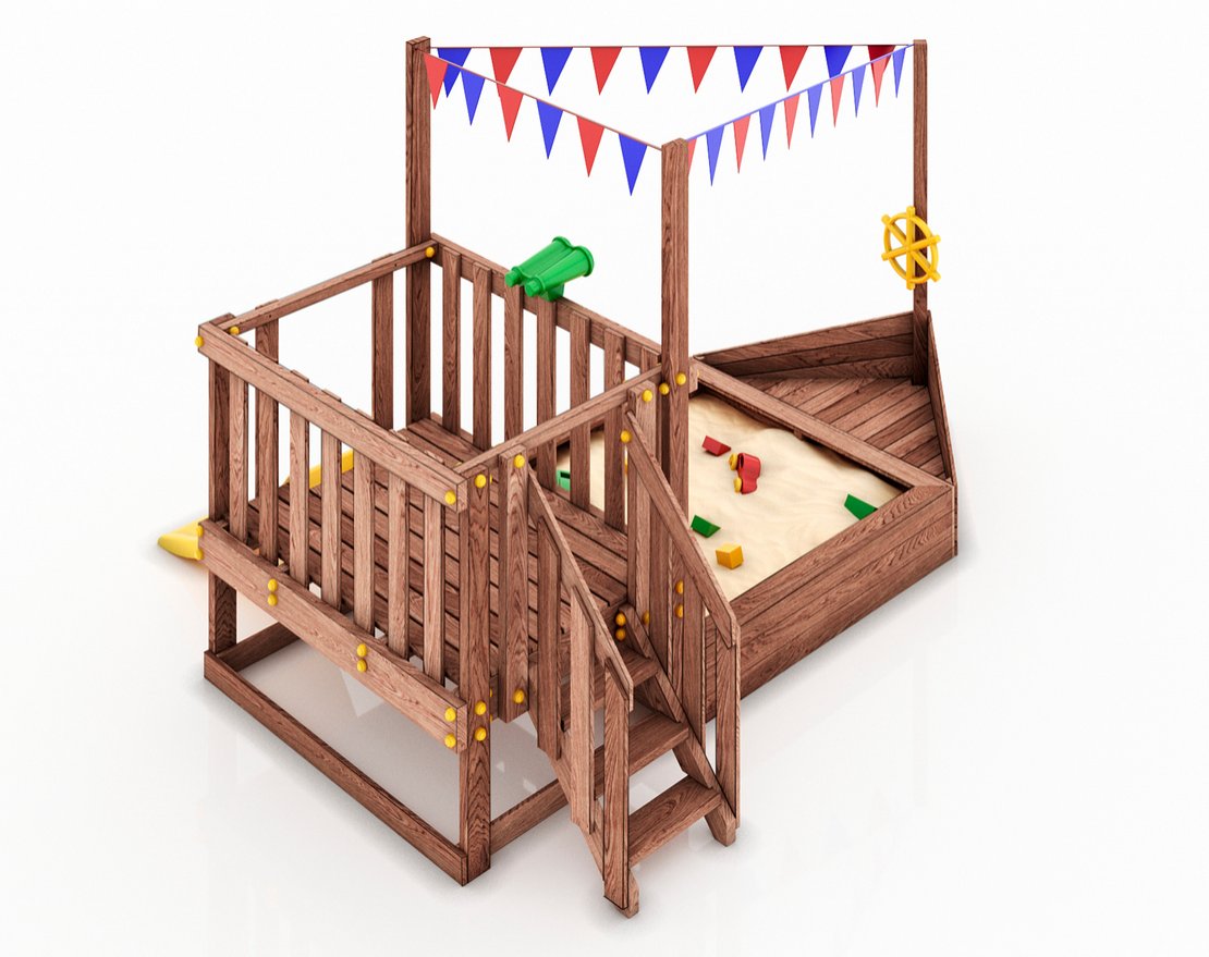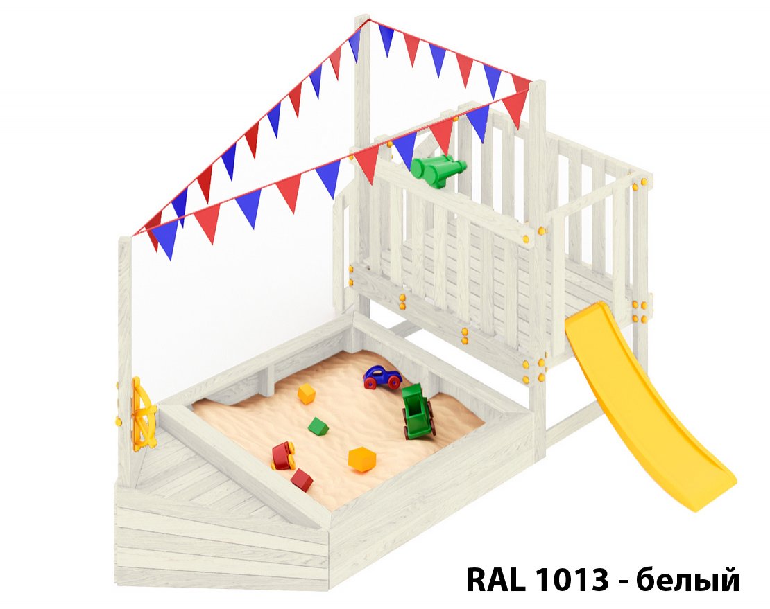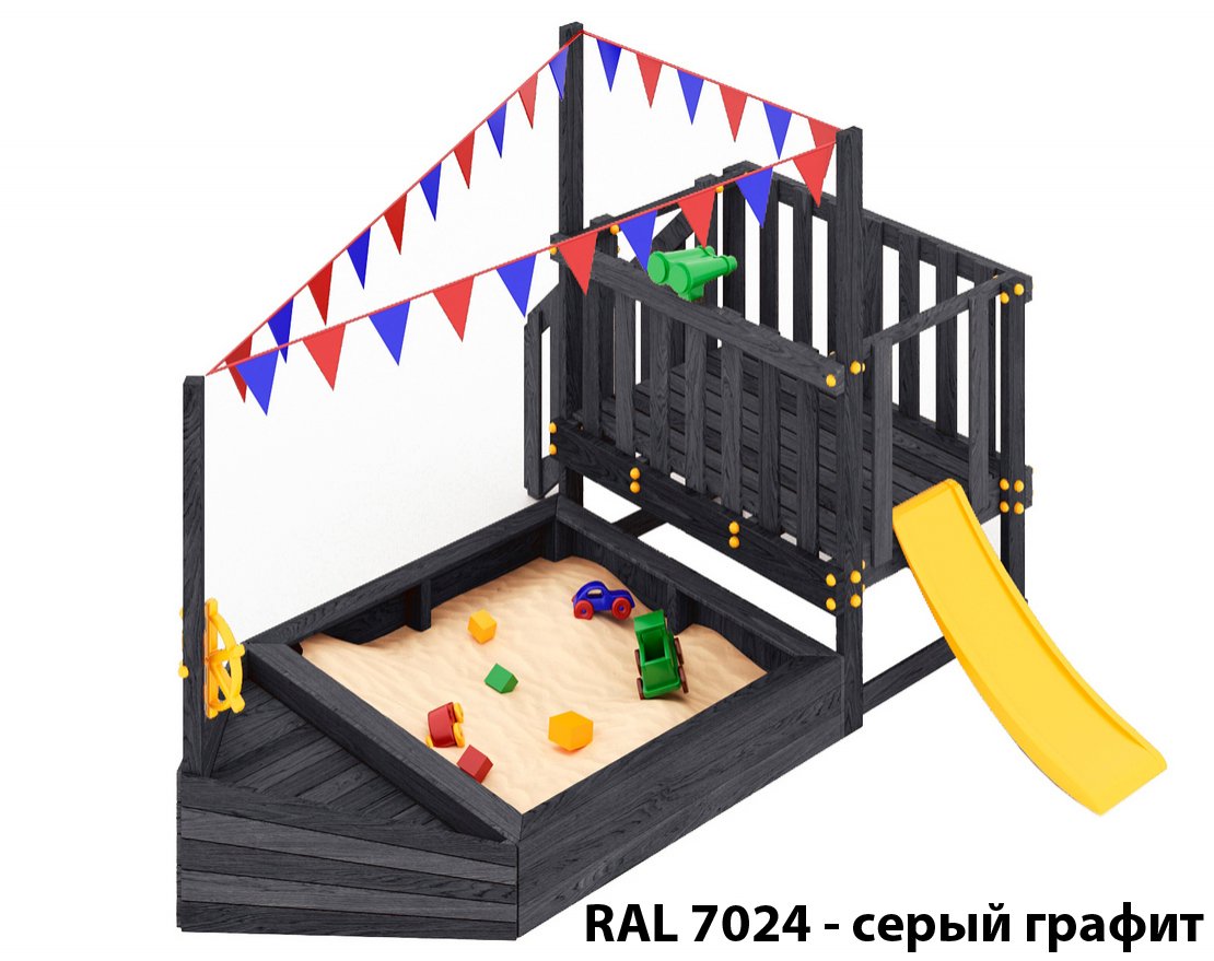 Детская песочница-кораблик и капитанский мостик с горкой с высоты 600 мм с флажками.