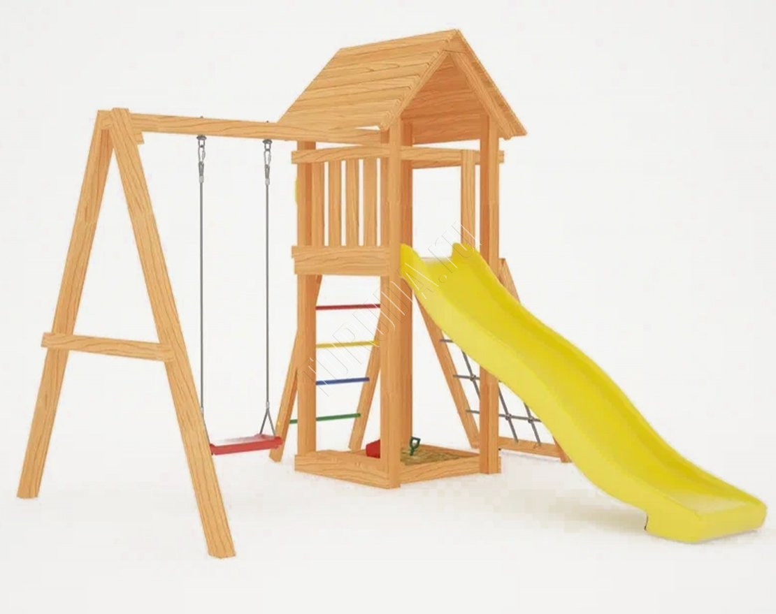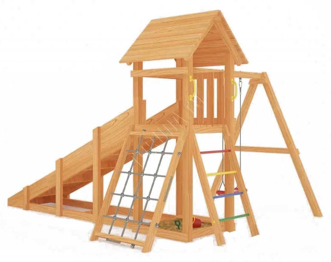 Площадка сохраняет геометрию рамы, содержит натуральные материалы, прошедшие сертификацию. Балки клееного бруса гладкие, острые края скруглены – отсутствие ран и ссадин важнее всего.