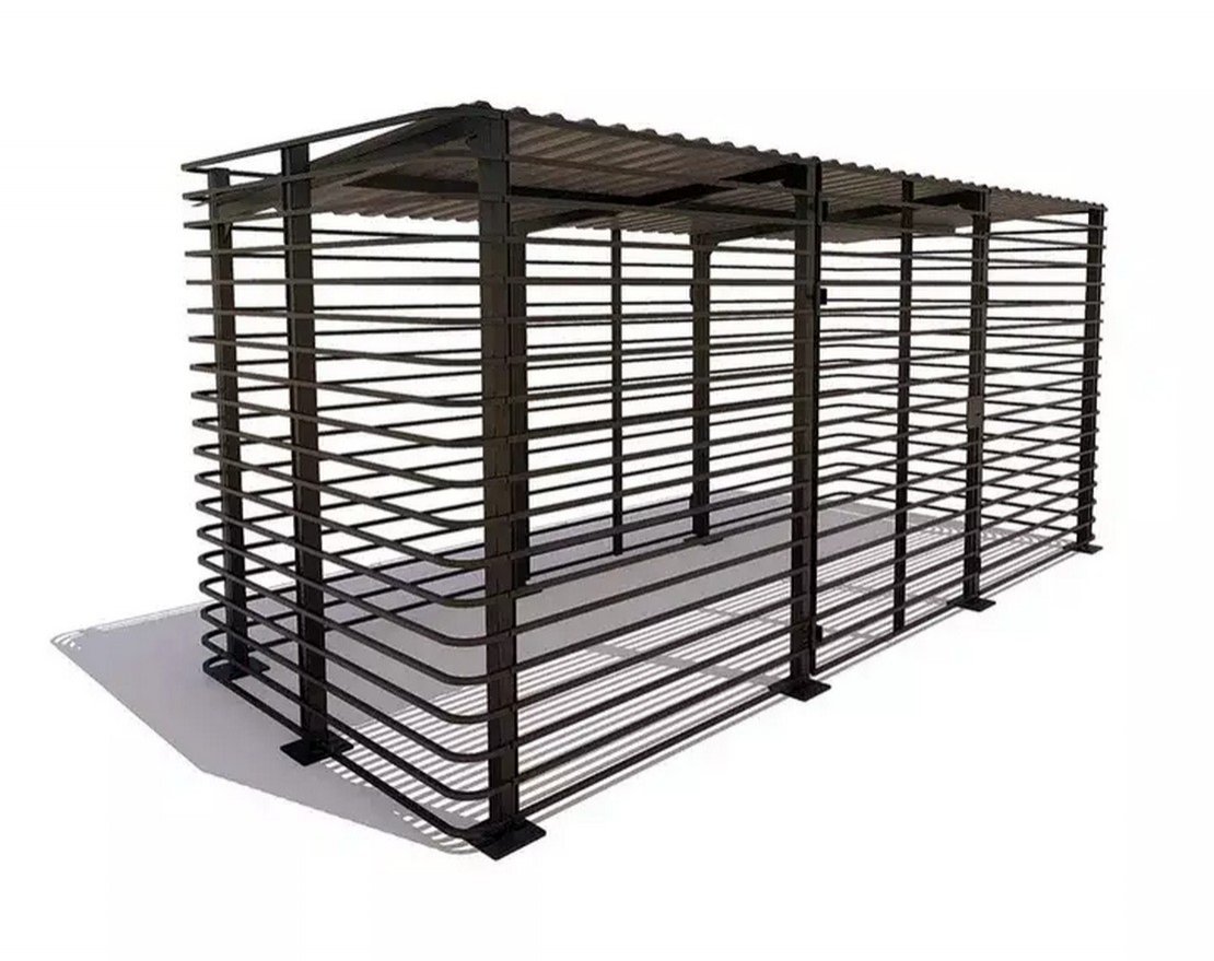 Контейнерные площадки рассчитаны на три мусорных бака, имеют сквозную конструкцию и крышу из профильного листа. Боковые стенки выполнены из труб, для поддержания каркаса установлены широкие металлические направляющие. На широкой части имеется калитка с замком, в проем легко проходит один бак, замок закрывается на ключ. На направляющих имеются установочные платформы с готовыми отверстиями, и объект можно размещать на неровной поверхности. Крыша защищает баки от непогоды и ограничивает к ним доступ. Сквозная конструкция визуально делает площадку меньше, за счет необычного выбора материала объект выглядит современно. Для облагораживания территории советуем купить контейнерные площадки современного типа, которые не испортят общее впечатление от оформления.