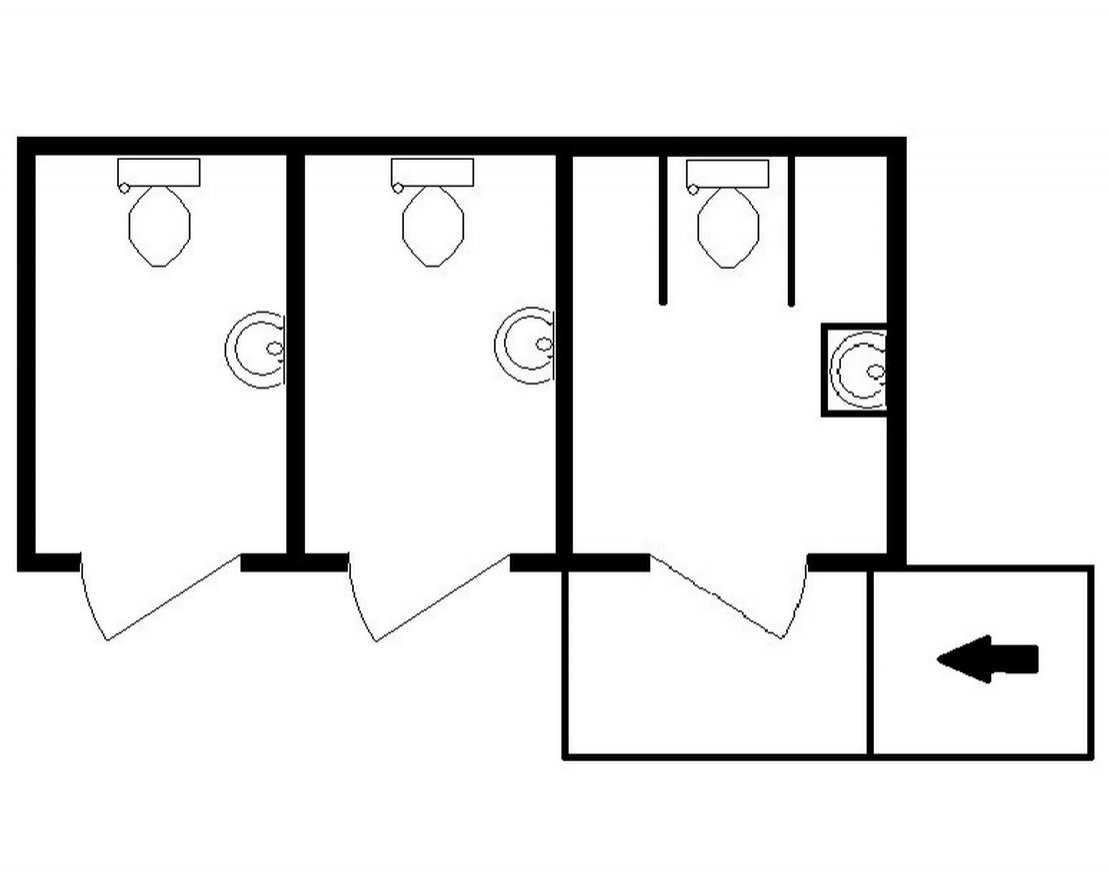 Самая продаваемая модель – универсальный туалетный модуль с санитарным помещением для Маломобильных Групп Населения – МГН. Две туалетные комнаты могут быть сконфигурированы в качестве отдельных Мужского и Женского туалетного помещения или двух универсальных секций М+Ж.