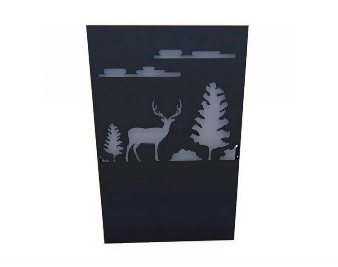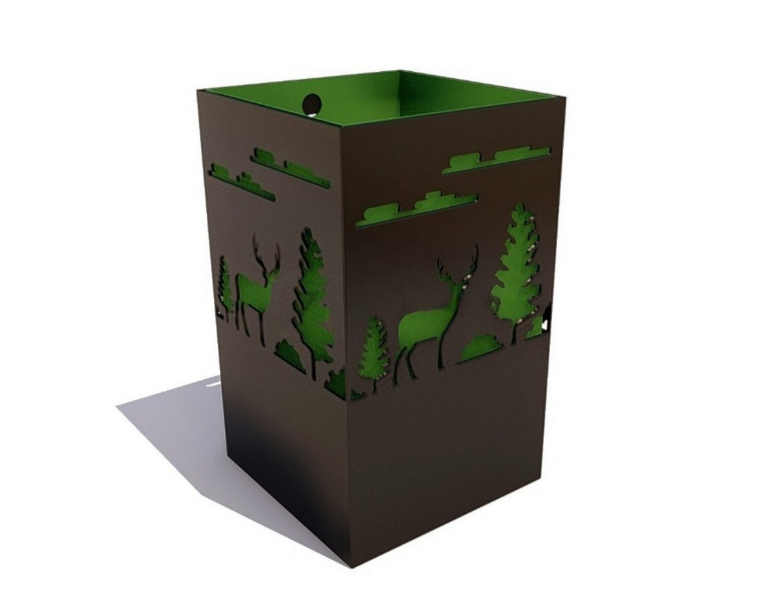 Внешний корпус урны «Тишина» выполнен из стали. Корпус украшают прорези в виде силуэтов оленей, сосен и облаков. Внутренний контейнер отличается цветом, в результате этого на стенках возникает изображение картины северной природы. Для изготовления стенок корпуса использована современная техника лазерной резки.